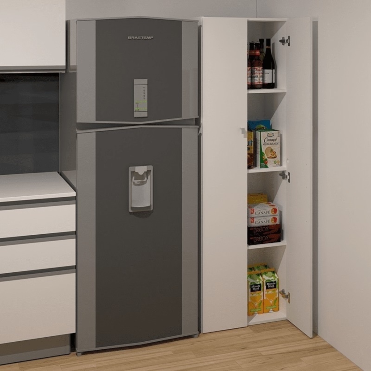 El despensero vertical cuenta con dos puertas frontales y con cuatro espacios divididos para el almacenamiento. Su diseño simple permite ser utilizado en diferentes ambientes.