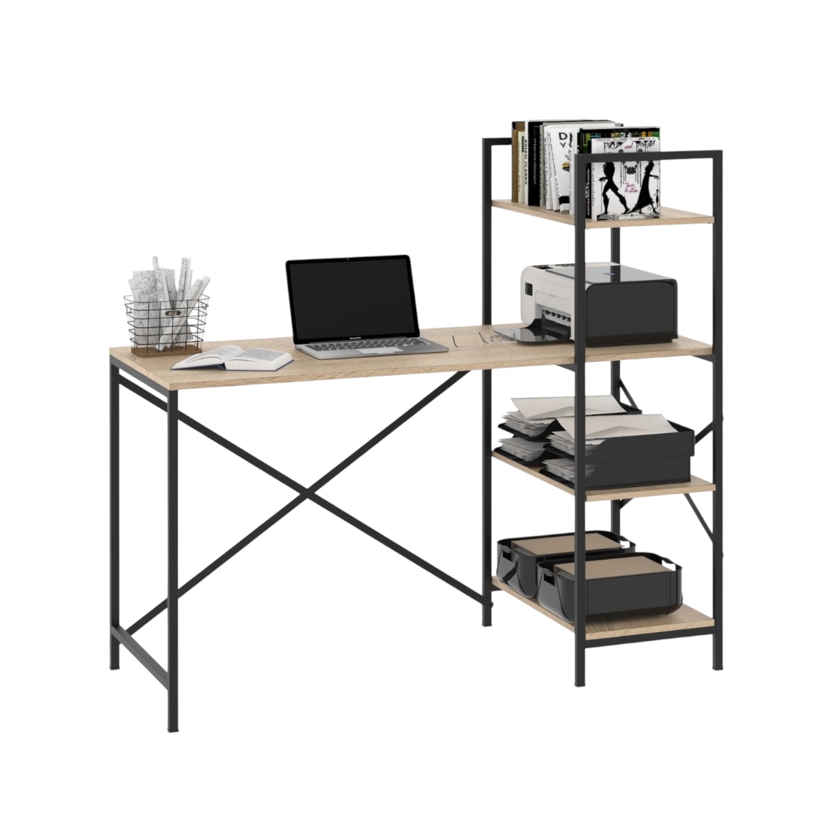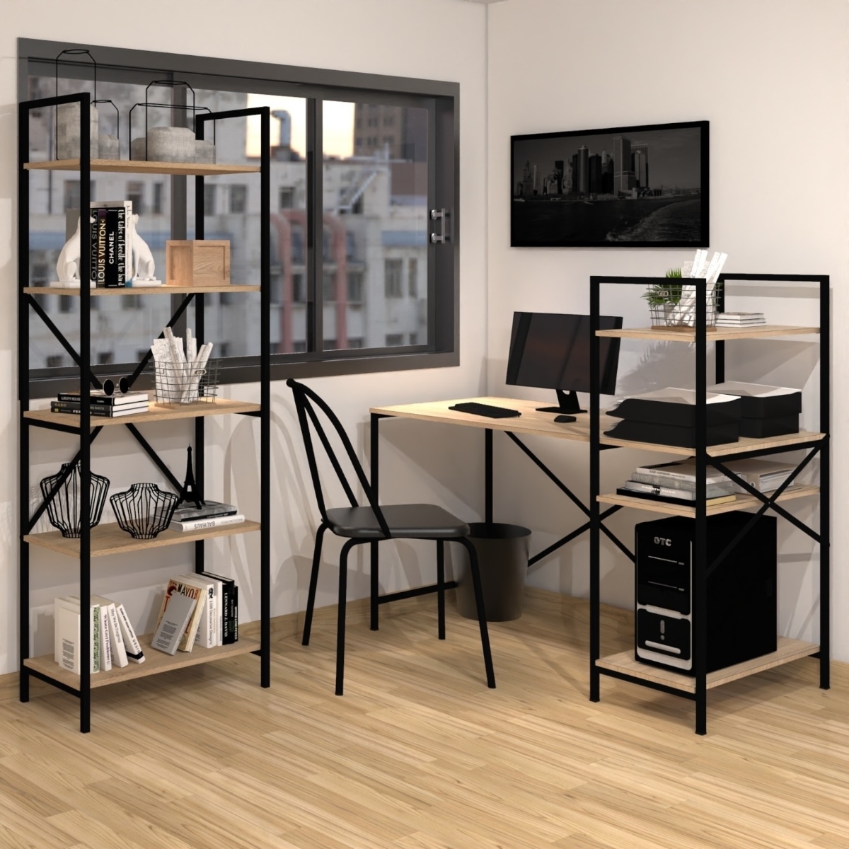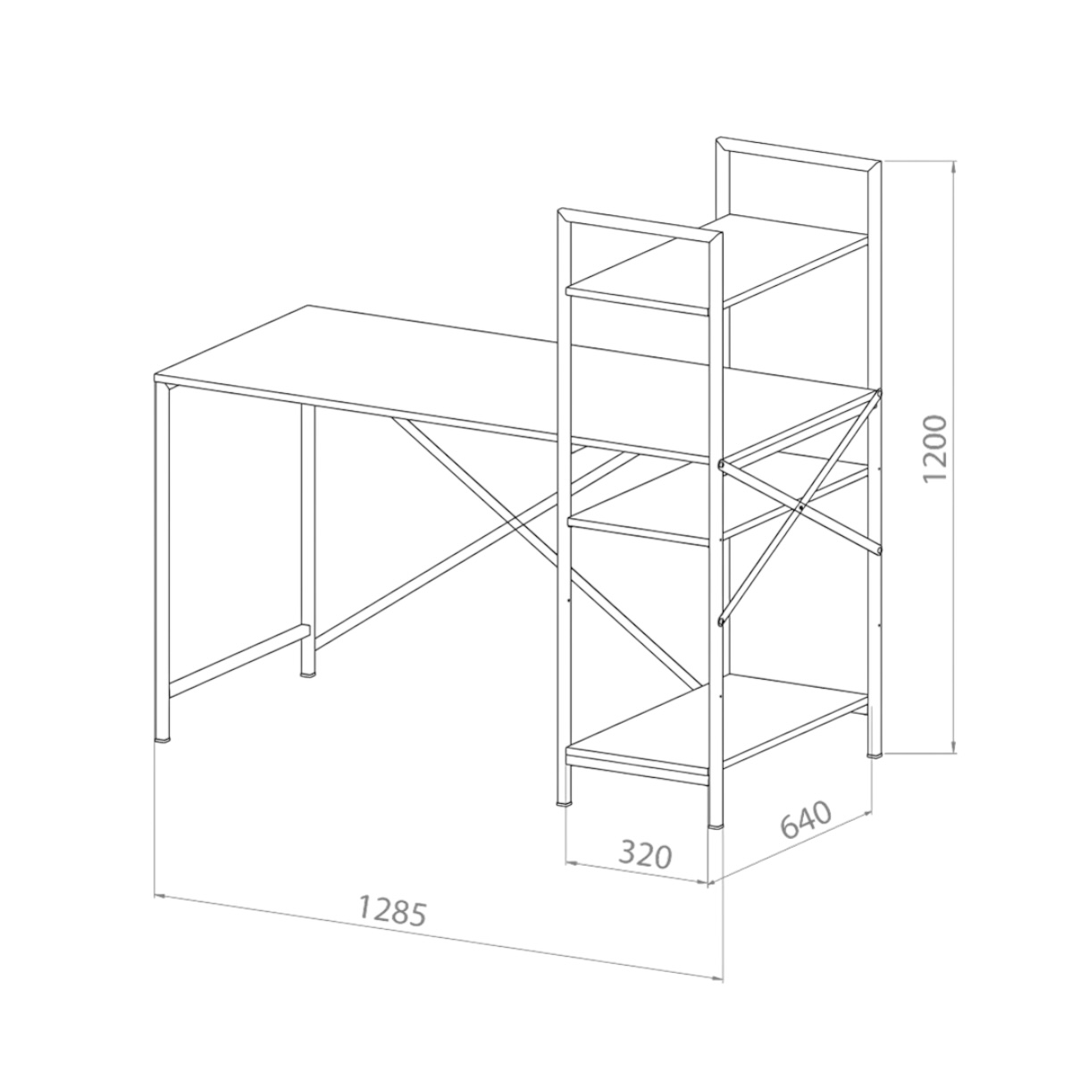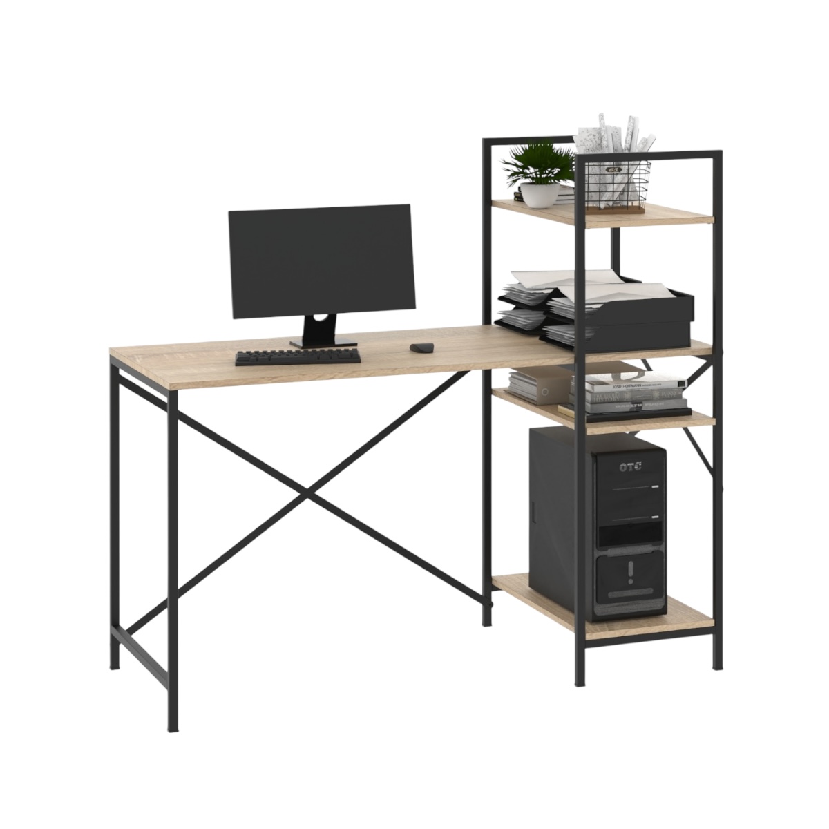 Este mueble es un escritorio simple de grandes dimensiones, con una biblioteca vertical en el lateral.