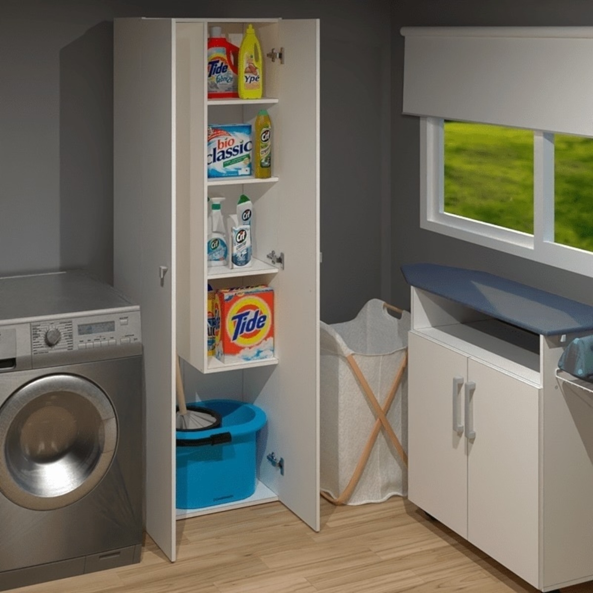 Cuenta con dos puertas frontales, y en su interior esta dividido en dos partes. Una de ellas es un espacio en donde se puede ubicar una escoba o una mopa, y en la otra parte estantes en donde se pueden colocar todo tipo objetos. Por otro lado, en la parte inferior, se puede colocar un balde sin ningún problema, por lo que se considera un mueble ideal para utilizar como organizador de productos de limpieza.